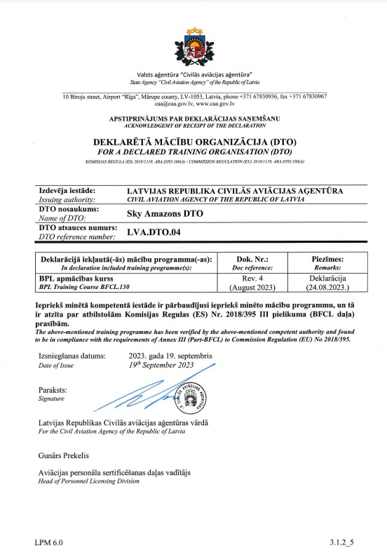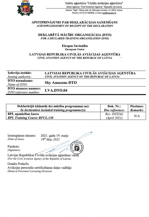 Sky Amazons Declared Training Organisation (DTO) is an officially declared training organization according to Commission Regulation (EU) No 1178/2011 with Reference No LVA.DTO.04 and the Competent Authority respect to its activities is State Agency “Civil Aviation Agency” Republic of Latvia.